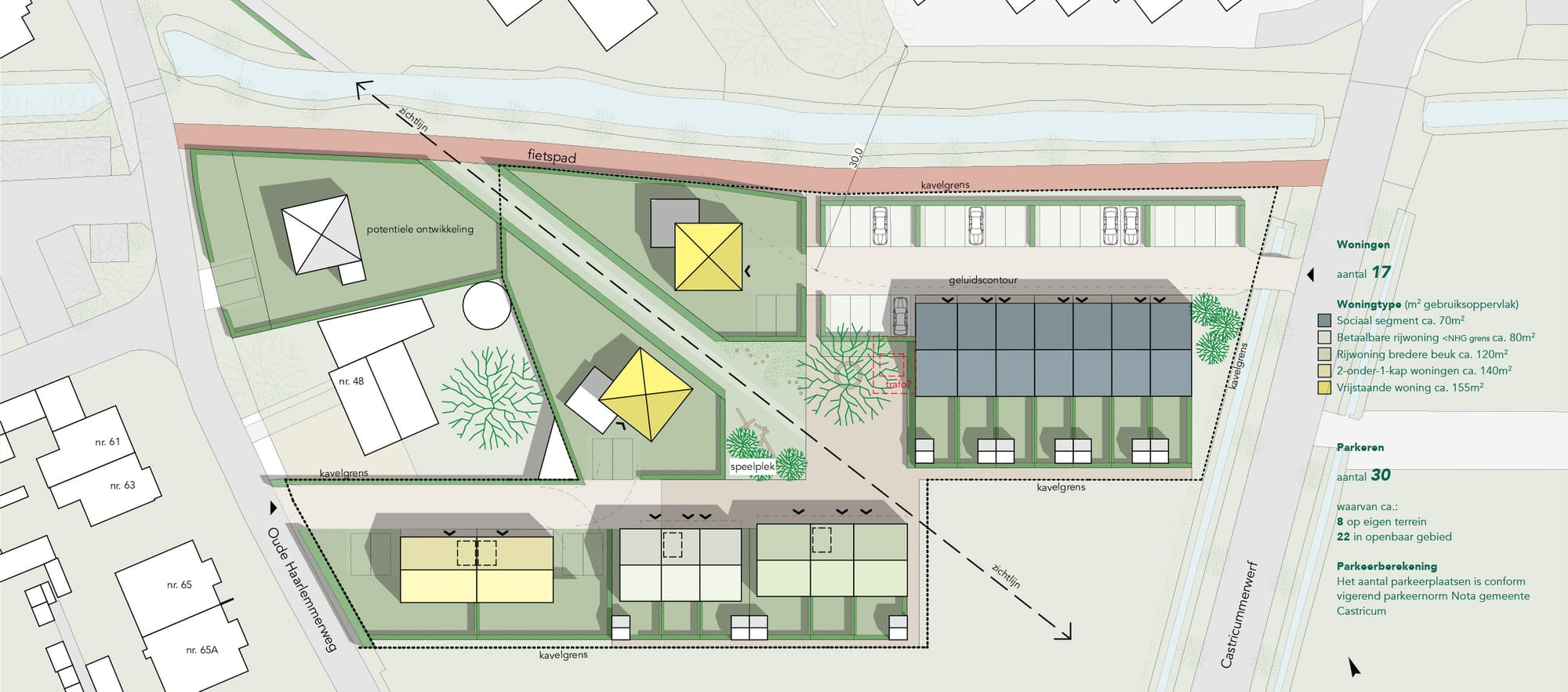 HSB wil als gezegd 17 woningen bouwen, waarvan dertig procent in de sociale sector moet vallen. Dat is een regel van de gemeente, met keuze uit sociale huur of sociale koop. De ontwikkelaar mikt op zeven sociale woningen van circa 70 vierkante meter en een achtertuin. Deze betaalbare woningen komen aan de straat genaamd Castricummerwerf te liggen, waar - kan ik uit ervaring zeggen - veel zwaar vrachtverkeer overheen gaat. Tegenover en naast de woningen komen 22 parkeerplaatsen, ook bedoeld voor andere nieuwe woningen.