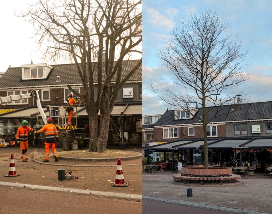 - De nieuwe boom op het horecaplein in Castricum is deze week geplant. De gemeente heeft de nieuwe bank er ook direct omheen geplaatst. Op onderstaande foto zie je links de recente kap van de oude kastanjeboom en rechts de nieuwe boom.