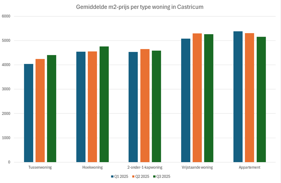 Om een beter beeld te krijgen van de ontwikkelingen op de Castricumse huizenmarkt, zoom ik ook weer in op de gemiddelde vierkantemeterprijs per type woning. Natuurlijk is het ene appartement heel anders dan het andere appartement en voor huizen geldt dat net zo goed, maar volgens Bonne kunnen vierkantemeterprijzen je wel een richting geven.