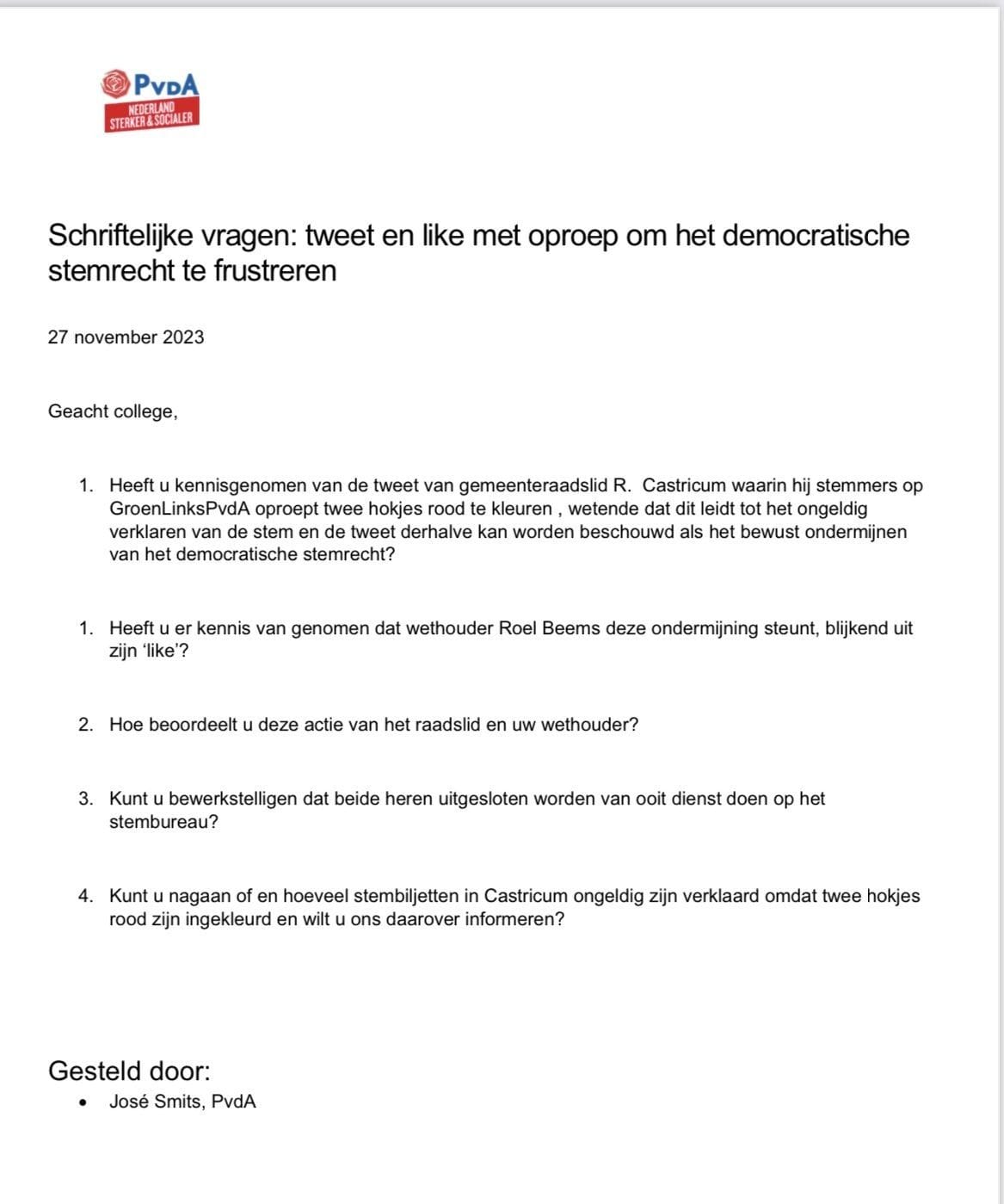 PvdA Castricum wil via de schriftelijke vragen aan B&W weten hoe de burgemeester en wethouders denken over de tweet van Castricum en de like van een van de wethouders. Onderstaande afbeelding toont de brief. Ralph Castricum heeft op X (voorheen Twitter) al van zich laten horen. Hij vindt de vragen van PvdA ‘zinloos’ en stelt dat het college betere dingen te doen heeft dan deze vragen beantwoorden. Het college heeft dertig dagen voor de beantwoording.