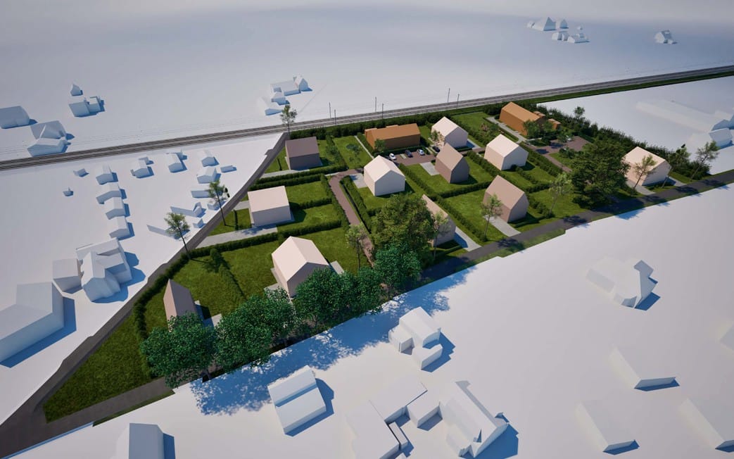Als de 25 woningen er komen, valt 30 procent in de sociale sector, 50 procent in de middenduur-categorie en 20 procent in de vrije sector. Bovenstaande afbeelding wekt een andere suggestie omdat we vooral vrijstaande woningen op grote percelen lijken te zien. Schijn bedriegt: er komen 5 vrijstaande woningen, 10 twee-onder-een-kapwoningen en 10 rijtjeswoningen. Volgens de ontwikkelaar zijn die rijtjeshuizen ook interessant voor starters. Bovenin de afbeelding loopt horizontaal de spoorlijn tussen Castricum en Heiloo. De woningen moeten bouwtechnisch daarom aan allerlei geluidseisen voldoen.