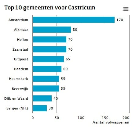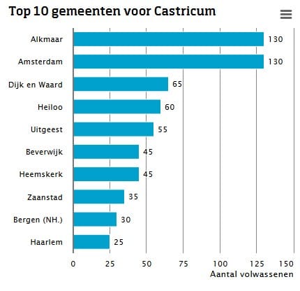 In 2022 zijn er 950 volwassen Castricummers verhuisd naar een andere gemeente binnen Nederland. Alkmaar en Amsterdam delen de eerste plek: beiden gemeenten verwelkomden dat jaar 130 personen vanuit Castricum. Daarna volgen Dijk en Waard (65), Heiloo (60) en Uitgeest (55). De top tien bekijk je hieronder.